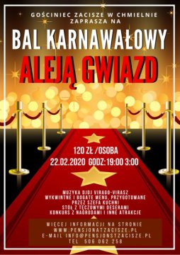 Zapraszamy na Niezapomniany Bal Karnawałowy Aleją Gwiazd. Zachęcamy gości do przebrania się za ulubioną gwiazdę czy idola lub ewentualnie do założenia maski. Ten wieczór jest okazją do niesamowitych wrażeń. Czerwony dywan, paparazzi i nie tylko sprawią, że poczujesz się jak celebryta. Chętnych fotoreporterzy zapraszają przed ściankę medialną:) Cały zespół Gościńca Zacisze w Chmielnie postara się uczynić ten wieczór wyjątkowym. Zapraszamy:)