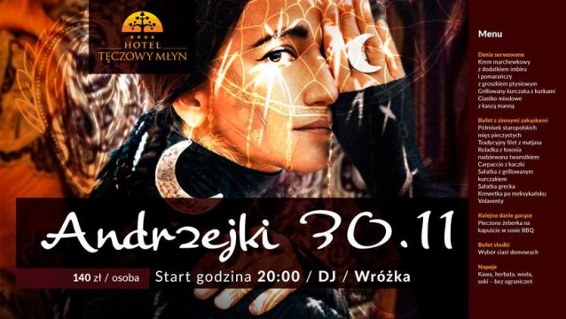 W ostatni piątek listopada zapraszamy do Hotelu Tęczowy Młyn na magiczną noc Andrzejkową wypełnioną wróżbami, doskonałą oprawą muzyczną. Wyśmienita zabawa, różnorodne potrawy oraz najlepsze trunki stworzą jedyny i niepowtarzalny klimat tego wieczoru. Kieruj się dobrym smakiem - wybierz Hotel Tęczowy Młyn