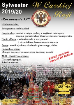 pieczony szczupak, łosoś garnirowany, owoce morza, tort peczenoczny z wątróbki, burzenina, sałatka vinegret z kiszoną kapustą i burakami, sałatka Olivier, sałatka Szuba, sałatka krabowa, cholodjec, pieczone mięsa wędliny,