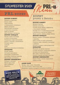 - bogate menu bufetowe w dwóch odsłonach - nowoczesnej i PRL! Bufety uzupełniane będą przez cały czas trwania zabawy (bufety: zimny, ciepły, deserowy)
