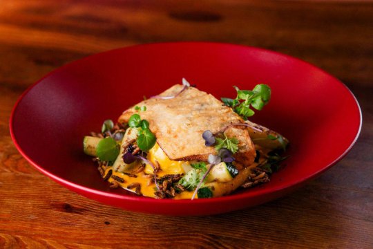 - Policzki wołowe z kaszą pęczak z grzybami, pieczona marchewka, konfitura z czerwonej cebuli, chips ze skorzonery