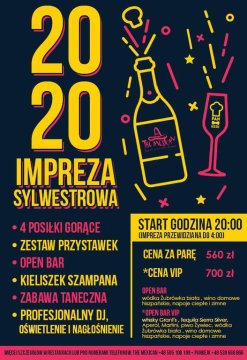 Oferujemy Państwu cztery posiłki gorące, zimne przystawki, bufet słodki, kieliszek szampana o północy, a co najważniejsze... OPEN BAR (wódka biała, wino domowe hiszpańskie, soki, woda oraz kawa i herbata) lub OPEN BAR VIP (whisky Grant's , tequila Sierra silver, Aperol, Martini, piwo Żywiec, wódka żubrówka biała, wino domowe hiszpańskie, napoje ciepłe i zimne )