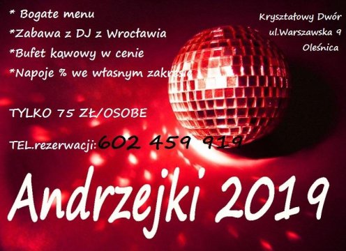 Zapraszamy na szaloną zabawę Andrzejkową. Zapewniamy bogate menu, zabawa z DJ.