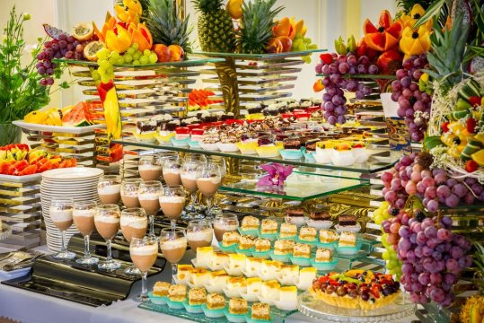 bufet słodki z szerokim wyborem ciast, deserów oraz owoców