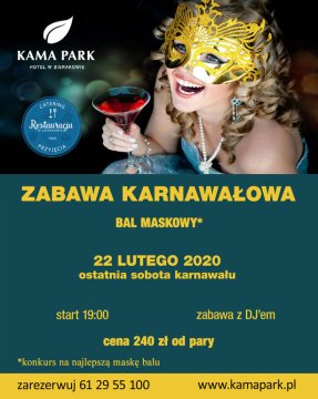 * Konkurs na najlepszą maskę balu. Nagrodą jest voucher na obiad dla 2 osób do restauracji w Hotelu KAMA PARK