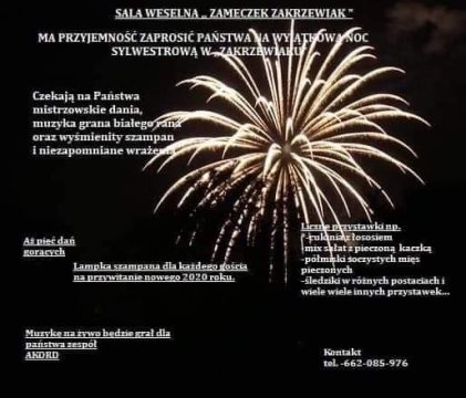 Zapraszamy Państwa na wyjątkową noc Sylwestrową w Zakrzewiaku. Czekają na Państwa mistrzowskie dania, muzyka grana do samego rana oraz wyśmienity szampan i niesamowite wrażenia. W cenie: szampan, pięć dań gorących, liczne przystawki, np. cukinia z łososiem, mix sałat z pieczoną kaczką, soczyste pieczone mięsa, śledziki w różnych postaciach.