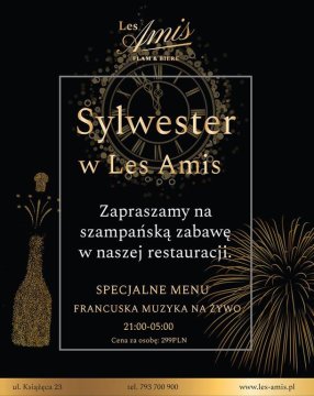 Zapraszamy wszystkich na Sylwestra w Les Amis. Gwarantujemy pyszne potrawy, francuską muzykę na żywo i niesamowitą, alzacką atmosferę! Zabawę rozpoczynamy o 21:00.