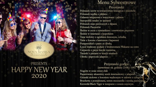 Klub Nova Maska zaprasza Państwa na NIEZAPOMNIANĄ NOC SYLWESTROWĄ w samym sercu stolicy. Specjalnie na tę okazję zagramy największe przeboje lat 80, 90 i współczesnych oraz przygotowliśmy specjalne niespodzianki. Menu składa się z najsmaczniejszych przystawek i specjałów naszego szefa kuchni. Na stołach zagoszczą również trunki w najlepszym gatunku. Gwarantujemy atmosferę i klimat, jakich nie ma w żadnym innym warszawskim klubie.