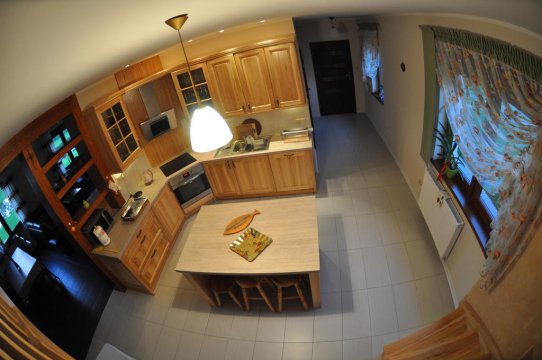 Kuchnia - płyta indukcyjna, piekarnik, kuchenka mikrofalowa, frytkownica, ekspres do kawy, zmywarka, blender, naczynia żaroodporne, komplet talerzy itp. dla 15 osób